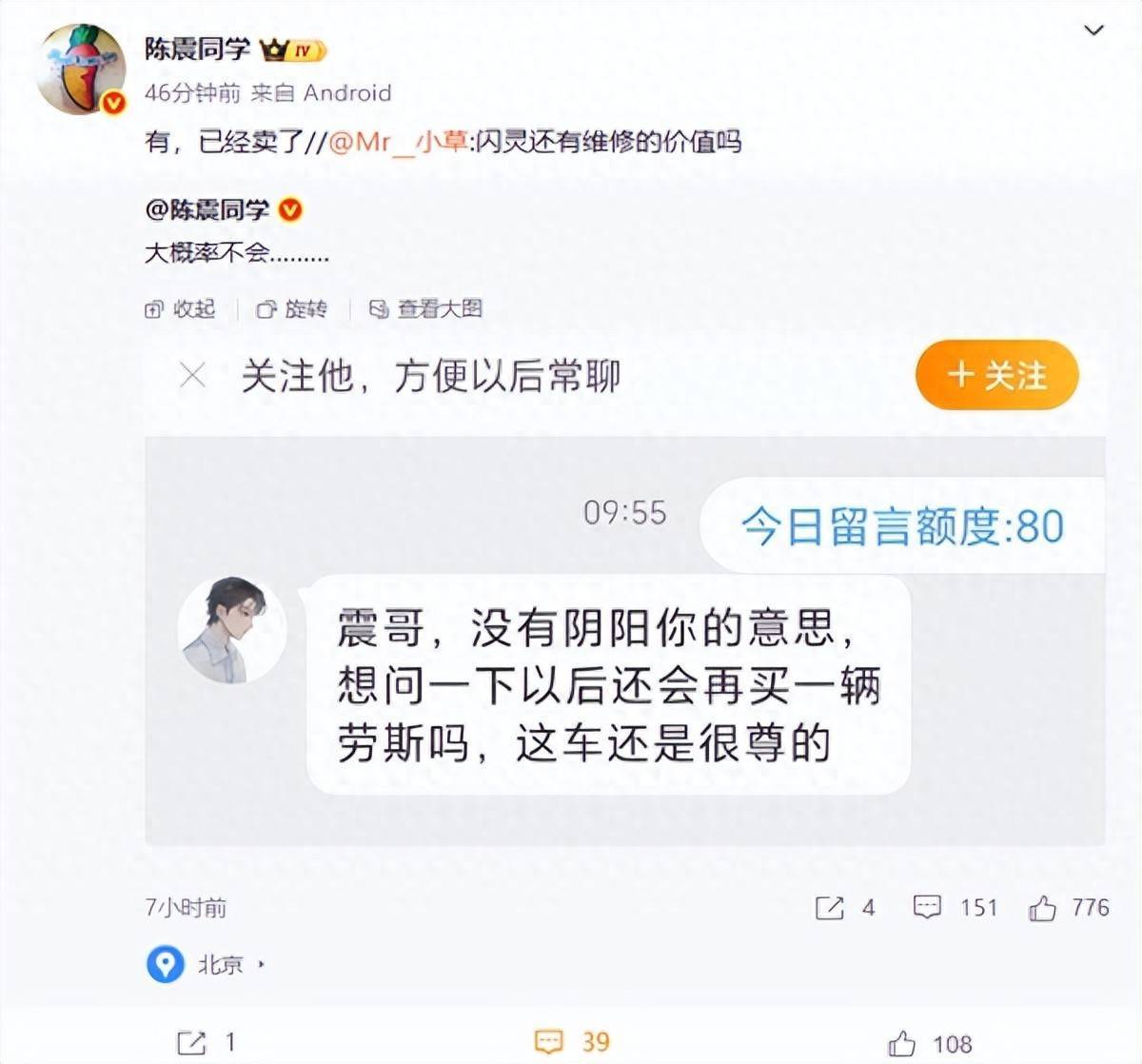 这不是陈震第一次卖劳斯莱斯了,此前陈震已经卖过一台库里南,理由是“受不了库里南不能远程开空调”。